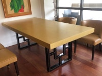 Blackened steel legs and frame.